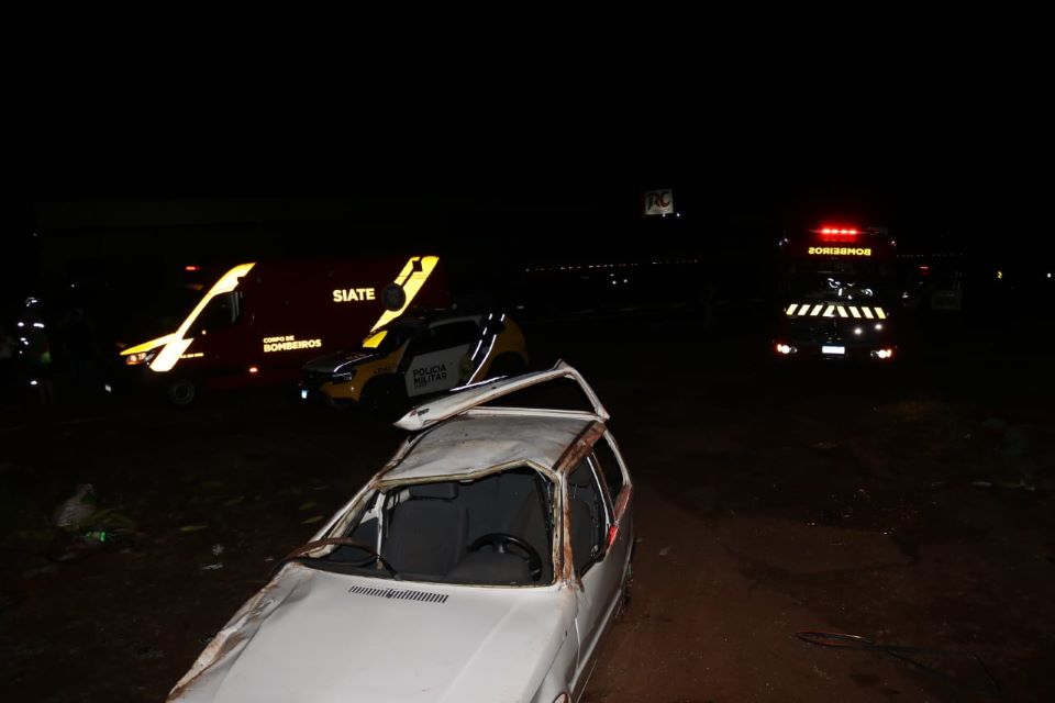 O Fiat Uno ficou parcialmente destruído com o impacto do acidente. As causas exatas do capotamento ainda serão apuradas.