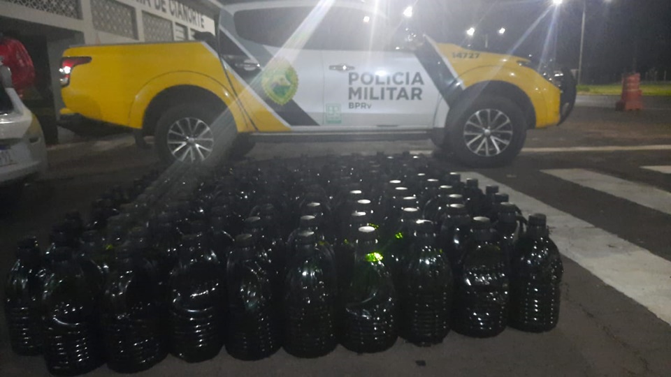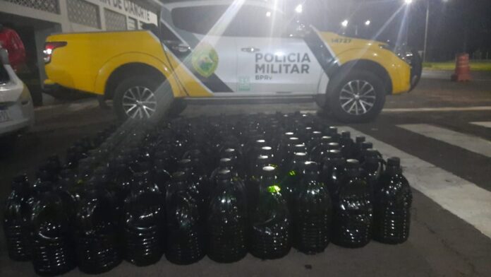 Durante uma abordagem de fiscalização de trânsito, em frente ao posto da Polícia Rodoviária Estadual de Cianorte, os agentes abordaram um veículo Hyundai HB20, carregado com 119 galões de litros cada um de azeite.