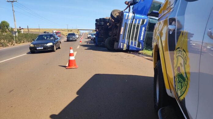 Um caminhão carregado com frango congelado tombou às margens da PRC-158, na saída do anel viário entre Campo Mourão e Peabiru. O acidente ocorreu por volta das 12h30 dessa sexta-feira, 1. Conforme vestígios no local e relato do condutor, o veículo seguia no sentido Campo Mourão a Peabiru quando, ao acessar a alça de entrada da rodovia, o motorista perdeu o controle da direção, resultando no tombamento do veículo no canteiro central da via.