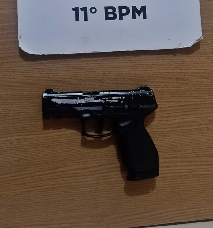 Na busca realizada, os policiais encontraram no banco traseiro um simulacro de pistola Taurus 24/7. O passageiro, de 26 anos, assumiu ser o proprietário do objeto e admitiu ter se envolvido em uma discussão em frente à conveniência, mas negou ter feito ameaças.