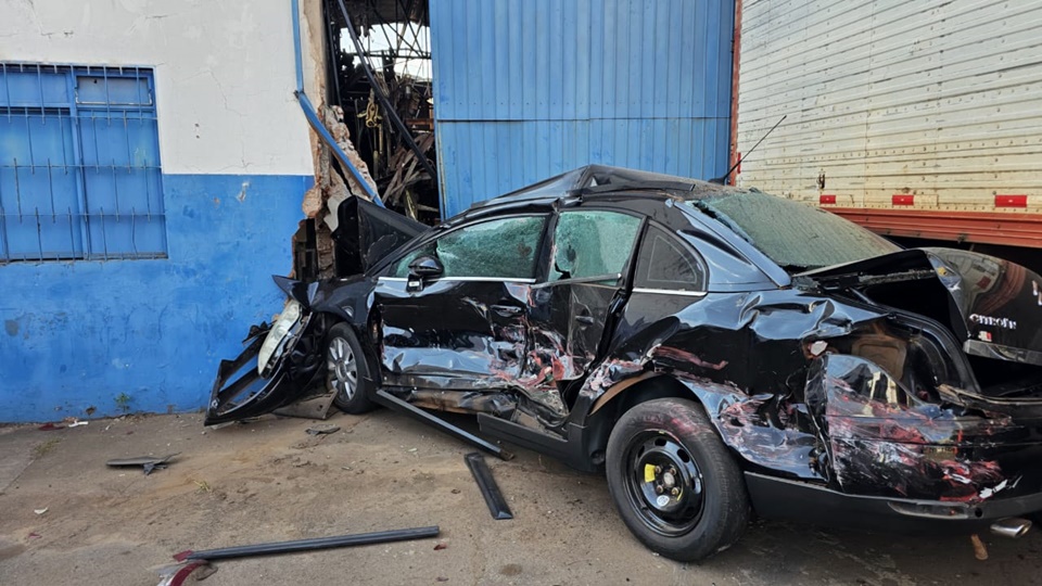 O veículo atravessou a rodovia e atingiu em cheio o Citroën, que estava estacionado em frente a uma distribuidora. O impacto contra a parede destruiu o automóvel.