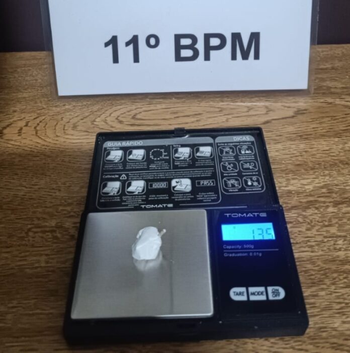 Na busca pessoal, nada de ilícito foi encontrado com o suspeito. No entanto, durante a varredura no local, os policiais localizaram uma bucha de cocaína que pesou 1,35 grama. Além disso, o condutor não possui Carteira Nacional de Habilitação (CNH) e a motocicleta apresentava débitos de licenciamento.