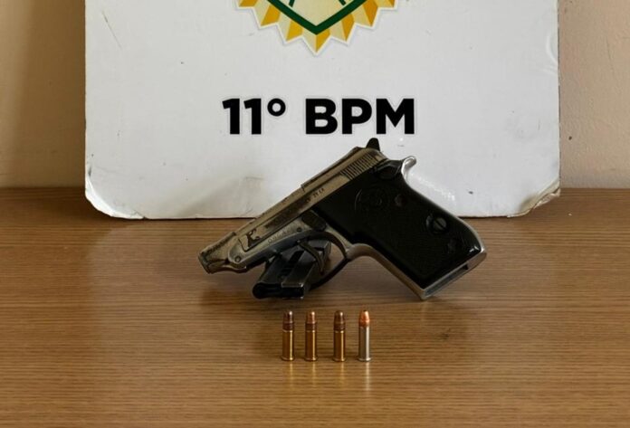 O condutor, que demonstrou nervosismo ao ser abordado, possui boletim anterior por porte ilegal de arma de fogo. Na busca veicular, os militares encontraram uma pistola Taurus calibre .22, municiada.
