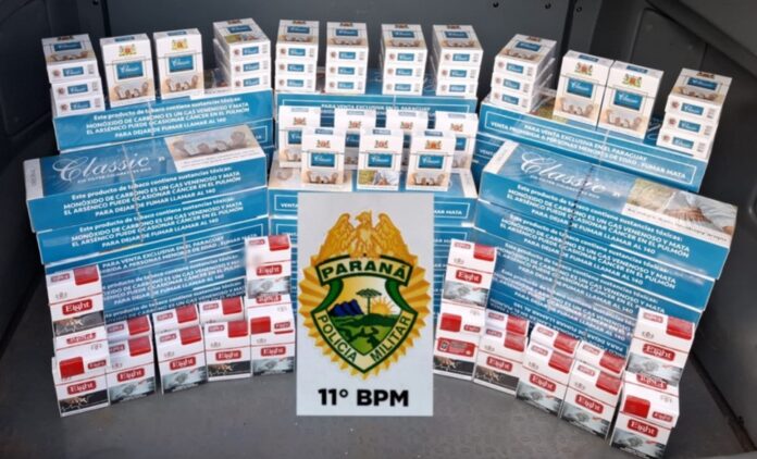 A Polícia Militar realizou uma grande apreensão de cigarros contrabandeados do Paraguai em um estabelecimento comercial, na cidade de Luiziana, na noite dessa sexta-feira, 10.
