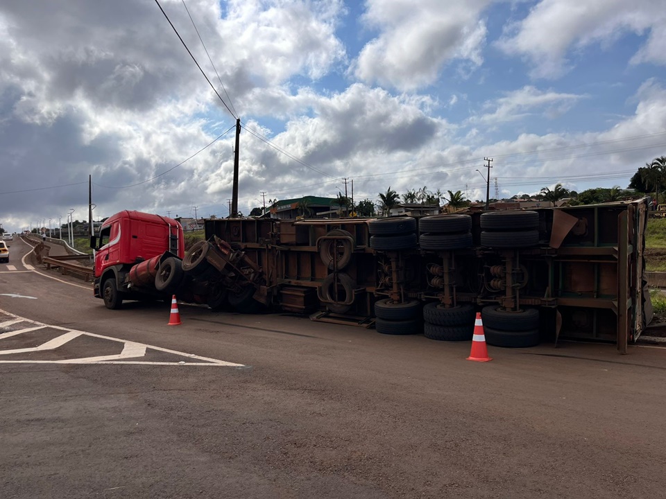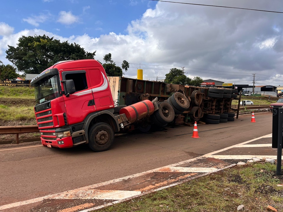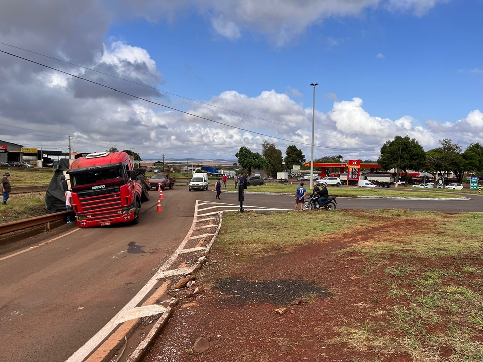 Ao tentar acessar a PR-317, no trevo, a carreta acabou tombando. Por sorte, a cabine permaneceu na posição normal evitando ferimentos no motorista. Os danos foram apenas materiais e a carga não se espalhou.