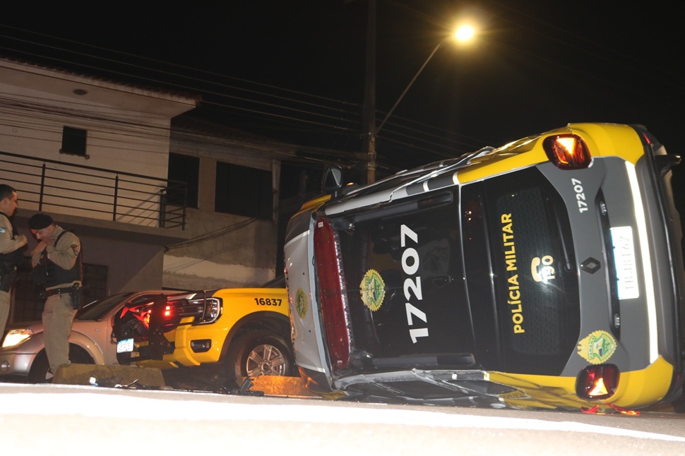 Uma viatura da Polícia Militar (PM) tombou na noite desta quarta-feira, 29, após colisão com um Jeep Renegade, em Campo Mourão. O acidente ocorreu na Perimetral Tancredo de Almeida Neves.