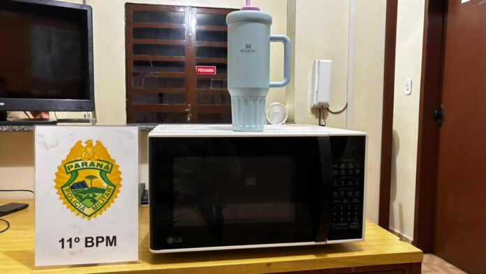 No local, os policiais encontraram produtos furtados do Centro de Referência de Assistência Social (CRAS) de Quinta do Sol, crime ocorrido na madrugada de terça-feira. Entre os objetos recuperados estavam um micro-ondas da marca LG, de cor branca, e um copo Stanley azul.