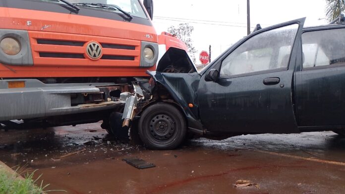 Um acidente entre um Ford Fiesta e um caminhão-baú deixou três pessoas feridas no início da noite de ontem, no trânsito de Campo Mourão. A colisão deixou três feridos, entre eles, um bebê de apenas 1 ano que estava no banco da frente, no colo de uma mulher.