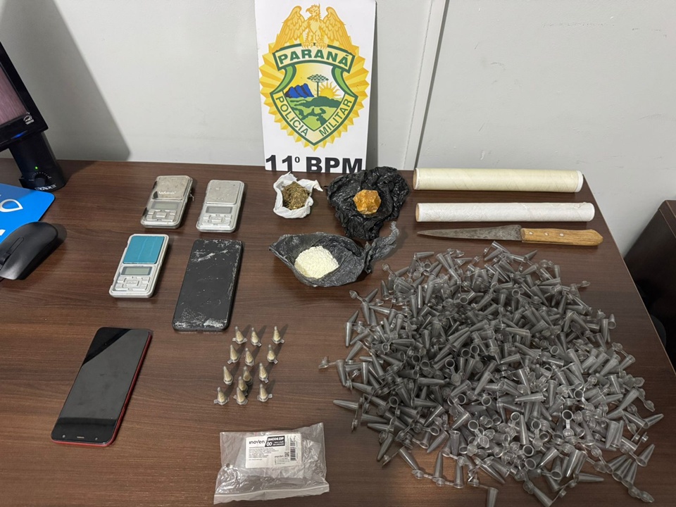 Em varredura no local onde o autor foi detido, foram localizados diversos entorpecentes e materiais utilizados para o tráfico de drogas, incluindo cocaína, crack e maconha, além de balanças de precisão, embalagens, faca para fracionamento, aparelhos celulares e dinheiro em espécie.