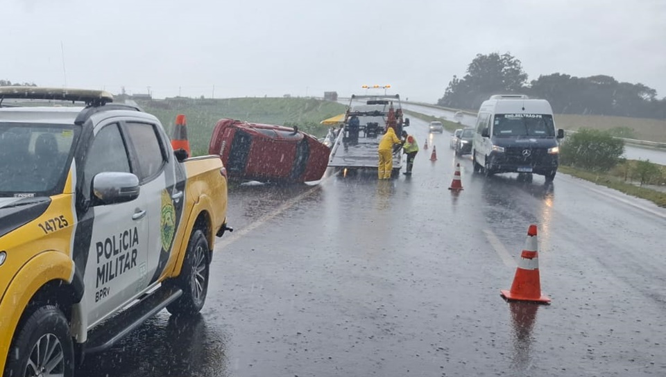 Antes de tombar, o veículo Citroen/C3 GLX aquaplanou devido à grande concentração de água sobre a pista. Descontrolado, o carro ainda bateu contra a defensa metálica parando tombado em posição lateral, com a porta do passageiro sobre o asfalto.