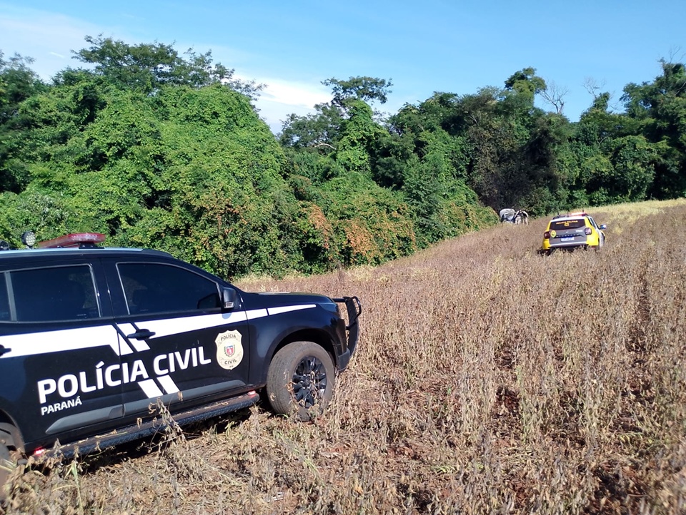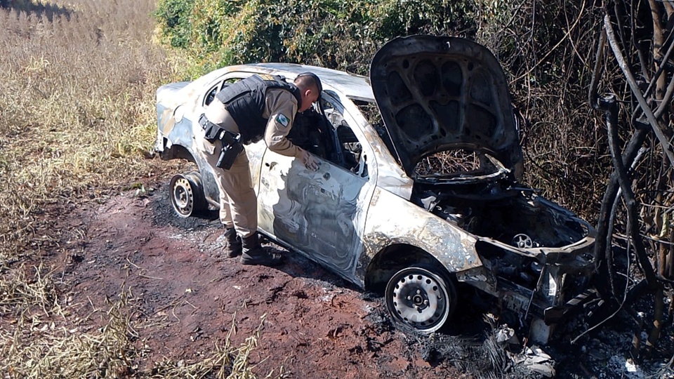 CARRO QUEIMADO – Ainda durante o atendimento da ocorrência, as forças de segurança receberam a informação de que um veículo estava em chamas em meio a uma plantação de soja, nos fundos do Jardim Sol Nascente, em uma área rural da cidade.