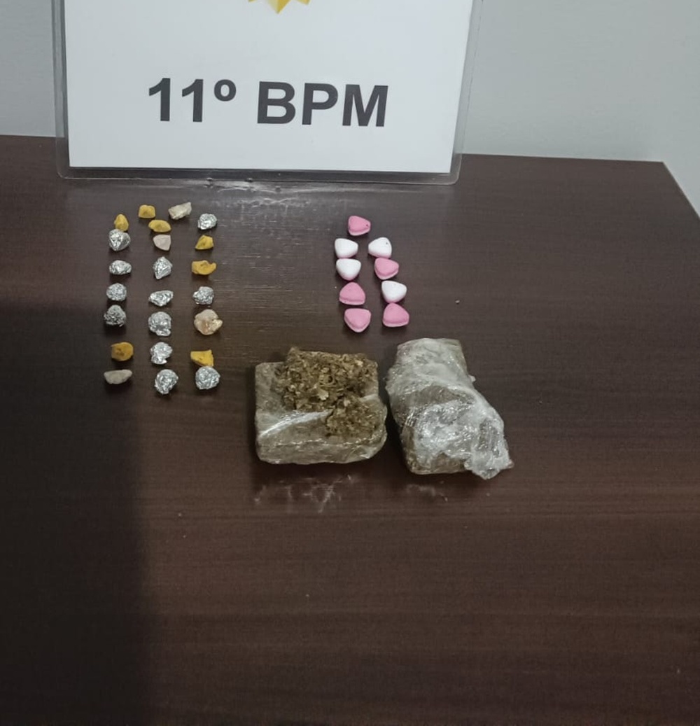 Os policiais fizeram busca domiciliar e localizaram porções de maconha, crack, comprimidos de LSD, além de embalagens utilizadas para fracionamento e armazenamento dos entorpecentes. Também foram encontrados diversos objetos de procedência duvidosa.