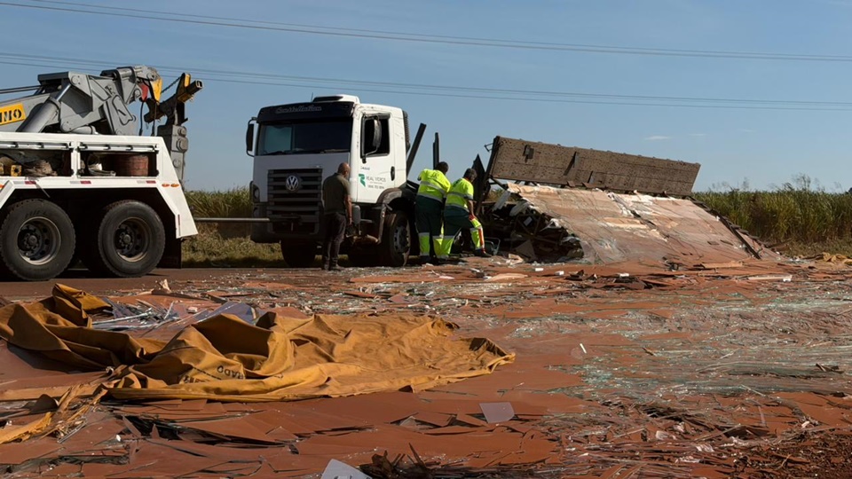 A carga de vidro estilhaçou-se sobre a pista. O motorista não se feriu. As circunstâncias do acidente serão apuradas pela polícia.