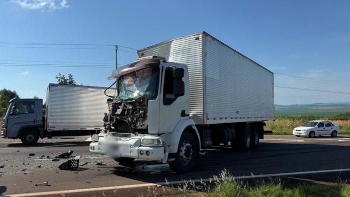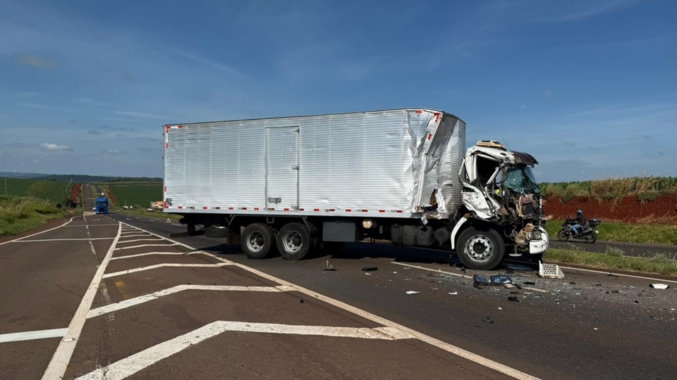 O motorista de um caminhão-baú da marca Volvo, identificado por Tiago dos Santos, 38 anos, seguia sentido a Maringá quando ocorreu a colisão com outro caminhão-tanque carregado com sebo, com placas do Paraguai.