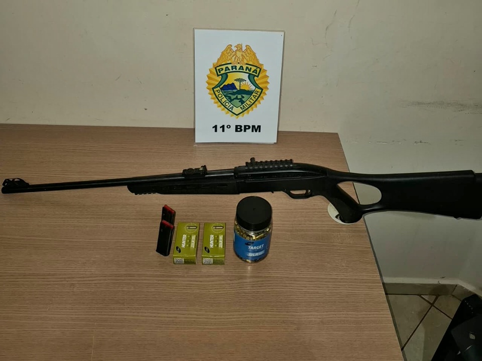 Os policiais foram até a propriedade e apreenderam a arma, um rifle calibre .22, carregadores e munições. O homem não foi encontrado. A arma e munições foram encaminhados à delegacia para investigação.