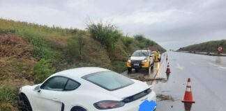 Em pista molhada, motorista perde controle e bate em barranco