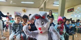 Coelhos da Páscoa visitam escolas e entregam ovos de chocolate para...